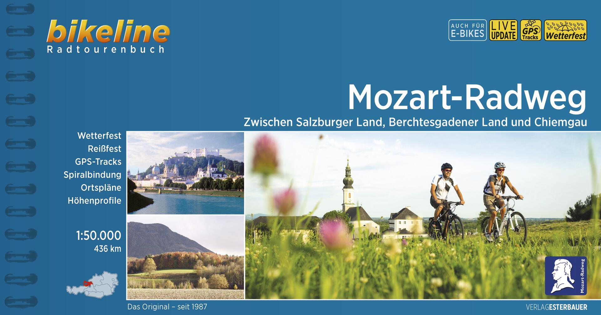 Salzkammergut, Salzburger Land, Chiemsee-Alpenland und Tirol – diese fünf Regionen stehen für wunderschöne Landschaft, erholsamen Urlaub, warme Badeseen, saftig grüne Almen, blühende Wiesen, gesunde würzige Luft und viele radelbare Wege. Salzburg – diese wunderbar lebendige Stadt – ist die Heimat von Wolfgang Amadeus Mozart. Der Mozart-Radweg verbindet nun die historisch bedeutsame Mozartstadt Salzburg an den Ufern der Salzach mit den beliebten Feriengebieten Tirol, Salzburger Land und Bayern miteinander. In einigen Orten und an einigen Plätzen kann man Wolfgang Amadeus‘ Leben erforschen und die Stellen besuchen, wo er und seine Familie verweilt haben: an den Ufern des Wolfgangsees, am Chiemsee in Seeon, Waging oder Wasserburg am Inn, um nur einige der Aufenthaltsorte zu nennen. Möge die Radtour in Mozarts Heimat für Sie genauso erholsam sein, wie es seine Aufenthalte hier für ihn waren!