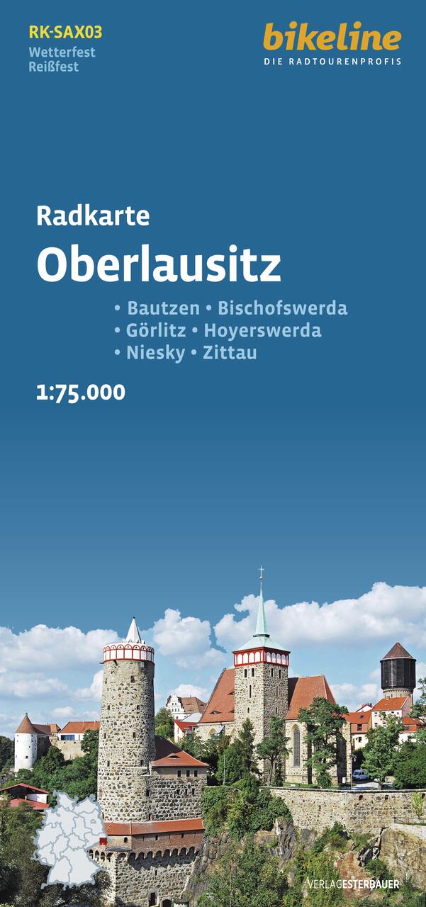 Diese Radkarte bildet einen großen Teil der Oberlausitz ab, eine Region, die zu etwa 67 % zu Sachsen sowie 30 % zu Polen und 3 % zu Brandenburg gehört. In Sachsen umfasst die Oberlausitz in etwa die Landkreise Görlitz und Bautzen. Im Nordosten des Landes Sachsens liegt die reizvolle Oberlausitzer Heide- und Teichlandschaft, die zu einem Fünftel als Biosphärenreservat ausgewiesen ist. Hier ist die Heimat der Sorben, jener nationalen Minderheit, die als Nachfahren der Milzener bereits seit dem 4. Jahrhundert in der Lausitz leben. Ihre Sprache und Kultur sind bis heute lebendig und Sie begegnen ihnen auf einer Radtour immer wieder auf vielfältige Weise. Die Landschaft wird geprägt von den zahlreichen Teichgebieten, die im 13./14. Jahrhundert von adeligen Grundherren in sumpfigen Niederungen und Senken angelegt worden sind. Seither gehört die Teichwirtschaft zu den wichtigsten Erwerbszweigen in der Oberlausitz. Eine weitere prägende Landschaft der Oberlausitz ist das Lausitzer Bergland, eine hügelige Mittelgebirgslandschaft, die den Oberlauf der Spree bis südlich von Bautzen begleitet. Hier müssen Sie mit der einen oder anderen Steigung rechnen, werden aber auch mit schönen Ausblicken auf die Landschaft belohnt. So ist die Gegend um den Kottmarwald bergig und waldreich, anmutig schmücken die charakteristischen, schieferverkleideten Umgebindehäuser die verschlafenen Dörfer. Im südwestlichen Kartenbereich ist ein Teil des Elbsandsteingebirges enthalten. Landschaftlich und kulturell gibt es viel zu erleben: entlang der Spree das Oberlausitzer Bergland mit den drei Spreequellen, den markanten Umgebindehäusern und der historischen Stadt Bautzen sowie nördlich der alten Hauptstadt der Oberlausitz die weitläufigen Spree-Talsperren mit ihren langen, weißen Sandstränden. An der deutsch-polnischen Grenze begeistern Zittau und Görlitz jeden Altstadt-Liebhaber. Interessante Städte sind zudem das „Tor zur Oberlausitz“ Bischofswerda, die von Herrnhuter Glaubensbrüdern gegründete Stadt Niesky sowie die Konrad-Zuse-Stadt Hoyerswerda. In Neschwitz erwarten Sie das Barockschloss und der schöne Schlosspark. Sehenswert sind auch die Krabat-Säule in Wittichenau, die an historischem Ort an die bekannteste Sagengestalt des sorbischen Märchengutes erinnert und Rothenburg, die östlichste Kleinstadt Sachsens. Eine Vielzahl von interessanten Fern- und Regionalradwege bildet das Grundgerüst des in dieser Karte abgebildeten Radwegenetzes. Hervorgehoben seien der Frosch-Radweg, ein ca. 270 Kilometer langer Rundweg, der Ihnen wie kein anderer die Oberlausitzer Heide- und Teichlandschaft näher bringen kann. Auf wunderschön geführten asphaltierten Fahrradwegen und -straßen des Spreeradwegs können Sie entlang des weitgehend naturbelassenen Flusses durch eine bezaubernde Natur radeln. Die Fahrt entlang des Grenzflusses Lausitzer Neiße zwischen Deutschland und Polen auf dem Oder-Neiße-Radweg bezaubert durch die einzigartige Naturnähe und entpuppt sich als äußerst abwechslungsreich. Auf der Sächsischen Städteroute können Sie von Kamenz über Bautzen und Löbau nach Görlitz gelangen.